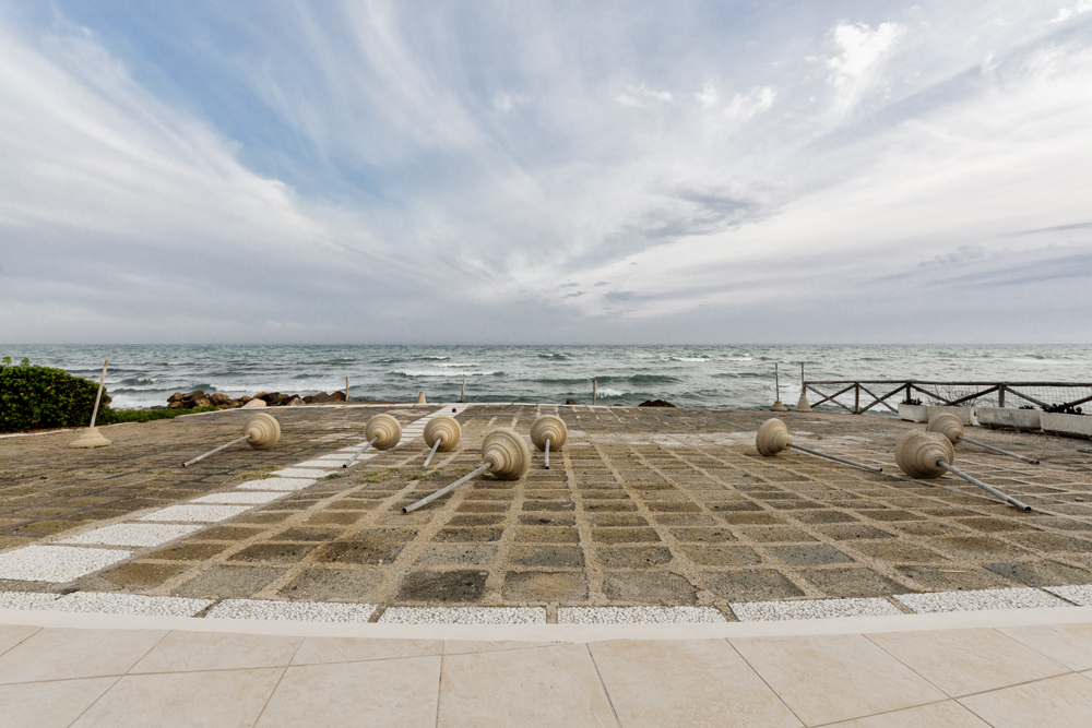 linee di tensione (e di torsione) ben efficaci nel trasmettere una visione straniante , ventosa; formidabili i piedestalli coi pali abbattuti e rivolti tutti al mare; la distorsione a barolotto nella fattispecie è congeniale al mood; il cielo è piuttosto chiaro, anch'esso in tono col mare invernale; si potrebbe peraltro pensare di drammatizzarlo un pò coi livelli