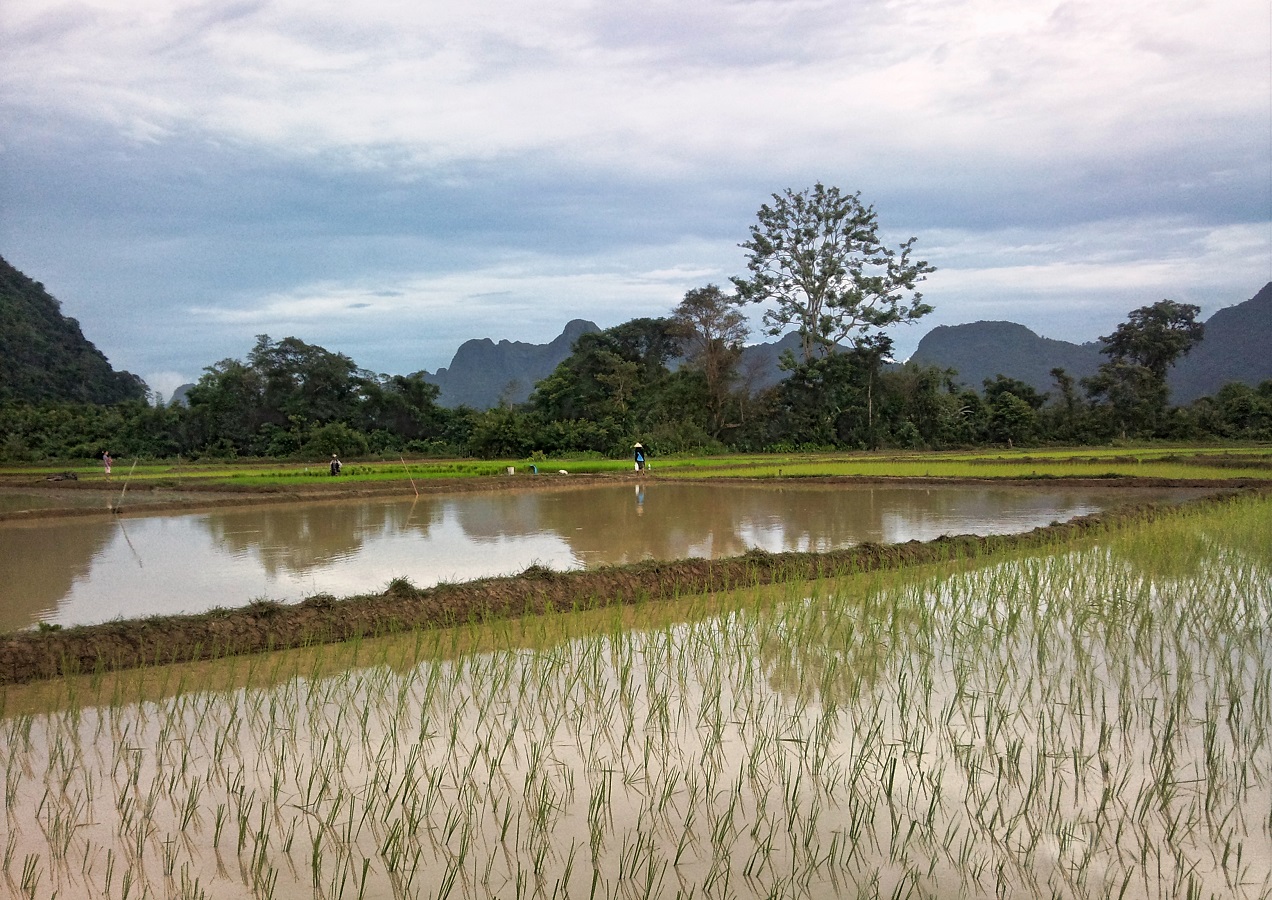 Coltivazioni a risaie, sotto un cielo dalle luce diffusa, in un verde declinato in umida naturalezza e minuscolo figurine la lavoro, non ultima quella perfettamente al centro della inquadratura.....
