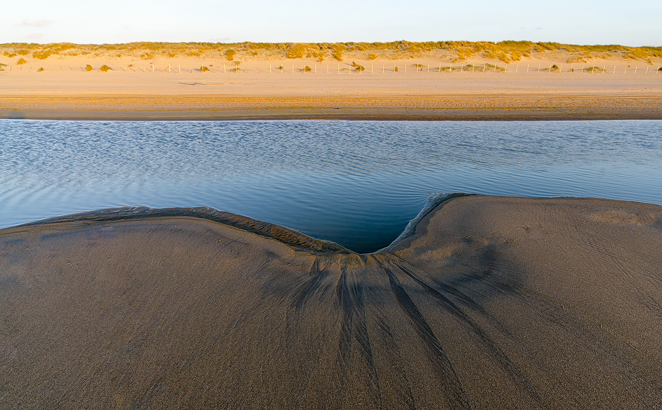L'acqua scivola e il suo lascito è una traccia a ventaglio di strie, nella sabbia umida, che disegnano frange più scure. Questa visione si fa apprezzare, oltre che per la particolarità del paesaggio, anche per la bellezza di luci e colori.