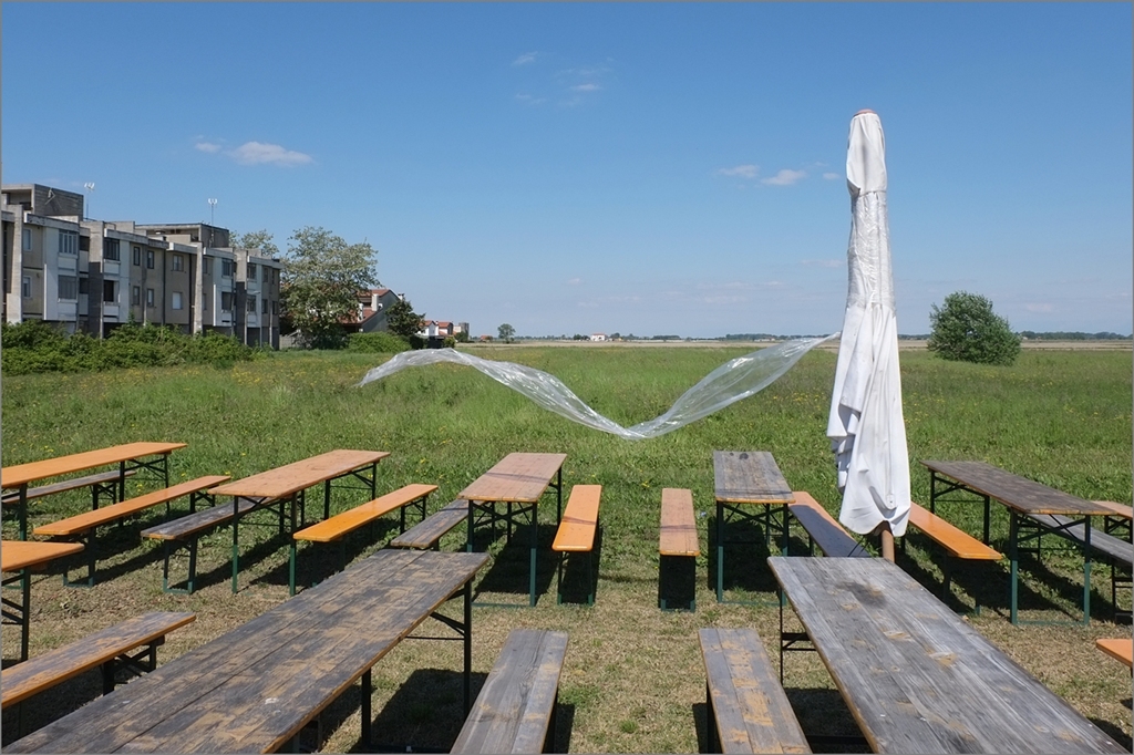 Il drappo di plastica al vento fa da contraltare alla geometria delle panche e dei tavoli.