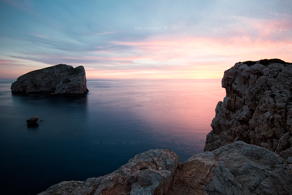 Molto classica, senza particolari specifici ,che rubino, fra di loro attenzione o protagonismo, ma proprio per questo una quieta serenità di visione, con una buona matericità delle rocce in primo piano, ma anche luminosità molto naturale, e ricche, screziate sfumature, di rosa ed azzurro ,ad avvolgere le rocce emergenti, e segnare diagonalmente il cielo. Ben restituita.