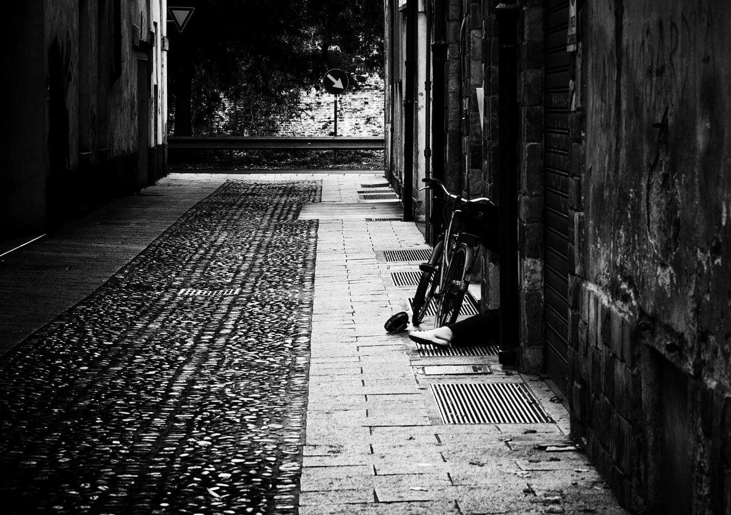 Un magnifico bn alla Weegee ci introduce in questa scena del crimine dalle svariate interpretazioni.Forse la bici lasciata come esca ed il malcapitato ladro soppresso e trascinato dentro per essere trasformato in saponette!Suggestiva l'ambientazione,ottima la gestione della luce quasi con effetto notte.Complimenti!  _________________ Sergio Demitri https://www.flickr.com/photos/124946035@N02/ |