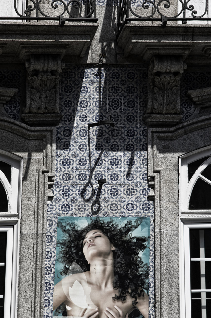 il megaposter della ragazza è molto bello, l'hao contestualizzato in questo taglio stretto che pero' a mio avviso sarebbe funzionato mantenendo la simmetria fra le due finestre ai lati. Andava raddrizzata, sistemate le linee cadenti ed avrei valutato se mantenere o meno i capitelli ( non credo sia il nome corretto) in alto.