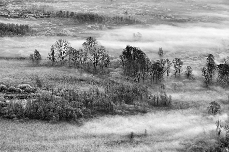 Che paesaggio! Gli alberi più scuri fissano la scena, eppure l'occhio vaga, tra nebbia e altri alberi...