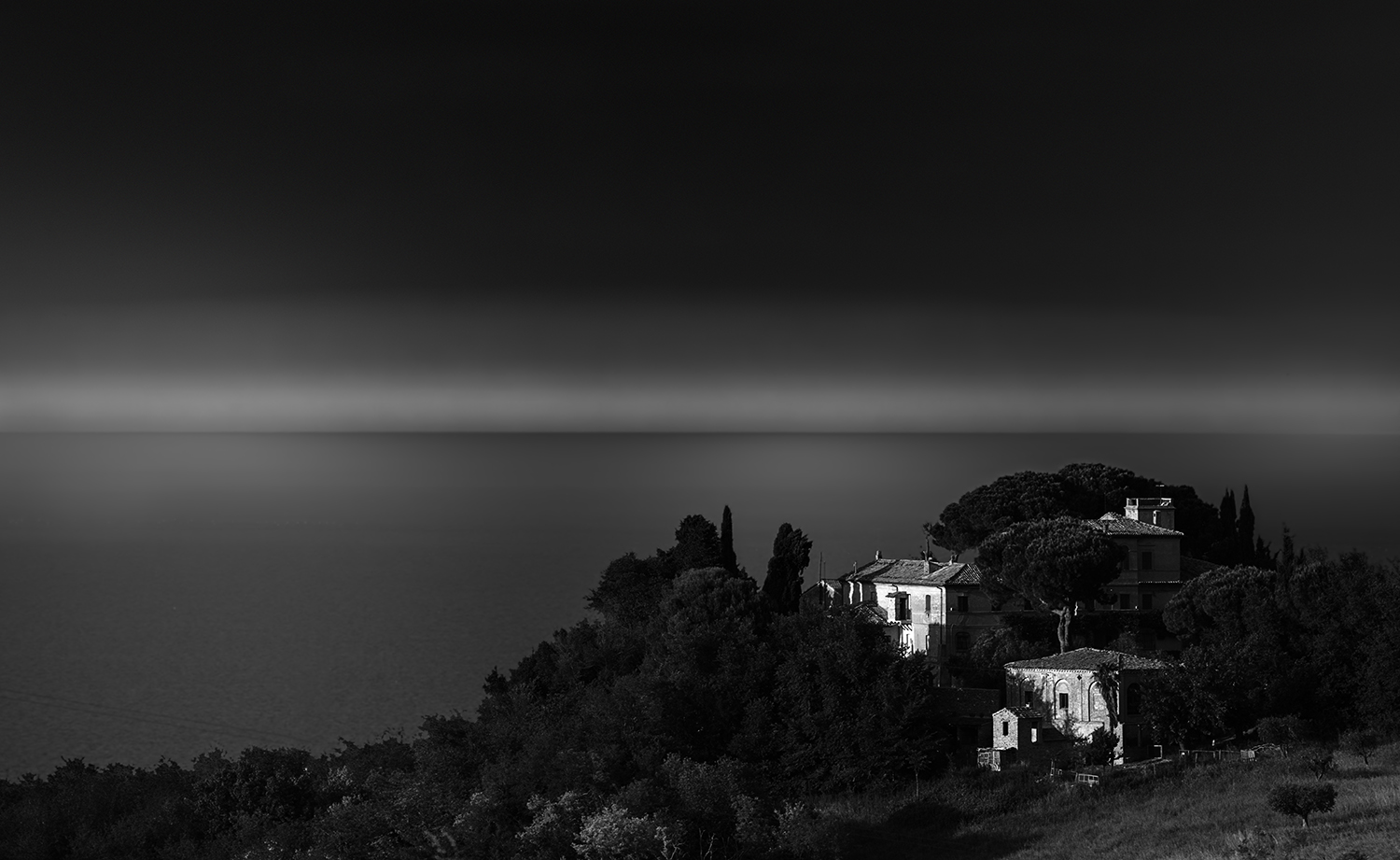 Anche per me idea tonale potenzialmente affascinante. Con un fulcro di grande suggestione, sul bianco potente della poche case, mentre il resto del mondo terraqueo attorno a loro si declina nella densità dei neri e dei grigi. Eppure si sono alcuni squilibri visivi, piccole incongruenze-imperfezioni , come un accenno di chiazza ovale ,a sinistra, a metà fra cielo e mare, e poi una lieve linea sottile di bianco che circonda i profili della vegetazione, e una scarsa gradualità di passaggio fra chiaro e scuro là dove la striscia di nuvole ,come posata sull'orizzonte, passa alla oscurità densa del resto del cielo. Bella ma perfettibile.