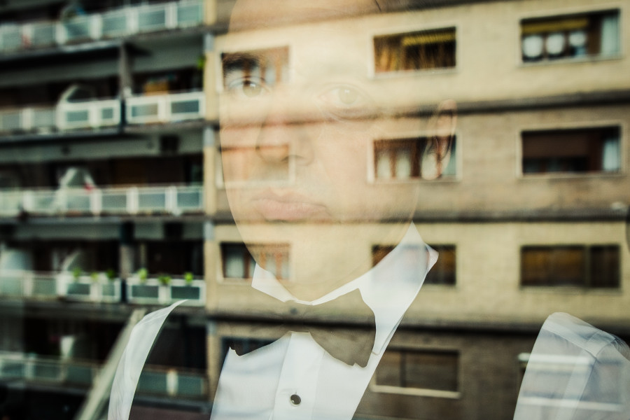 Ti hanno dato un ottimo suggerimento per una serie potenziale. Ma a me piace questo ritratto singolo, nella sua colorata vaghezza e nel suo contesto. Volto, espressione, abbigliamento: tutto si lascia intendere attraverso il vetro. A me fa pensare alla malinconia di un mattino senza sole, al risveglio. Il protagonista, dopo i fasti di una serata speciale, ed elegante, si ritrova nella realtà più scialba e monotona del quotidiano diurno. Potrebbe essere un invitato che ha speso al carta della sua festa, ma anche il portiere di notte, che lascia il turno e sta per andare a riposare...