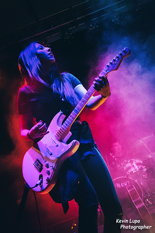 Il batterista che fa capolino sullo sfondo, con l'acustica che un pò impalla la cassa; lei sta chiaramente eseguendo un riff d'accompagnamento ed è bello lo sguardo rivolto probabilmente verso i suoi compagni/compagne di band.