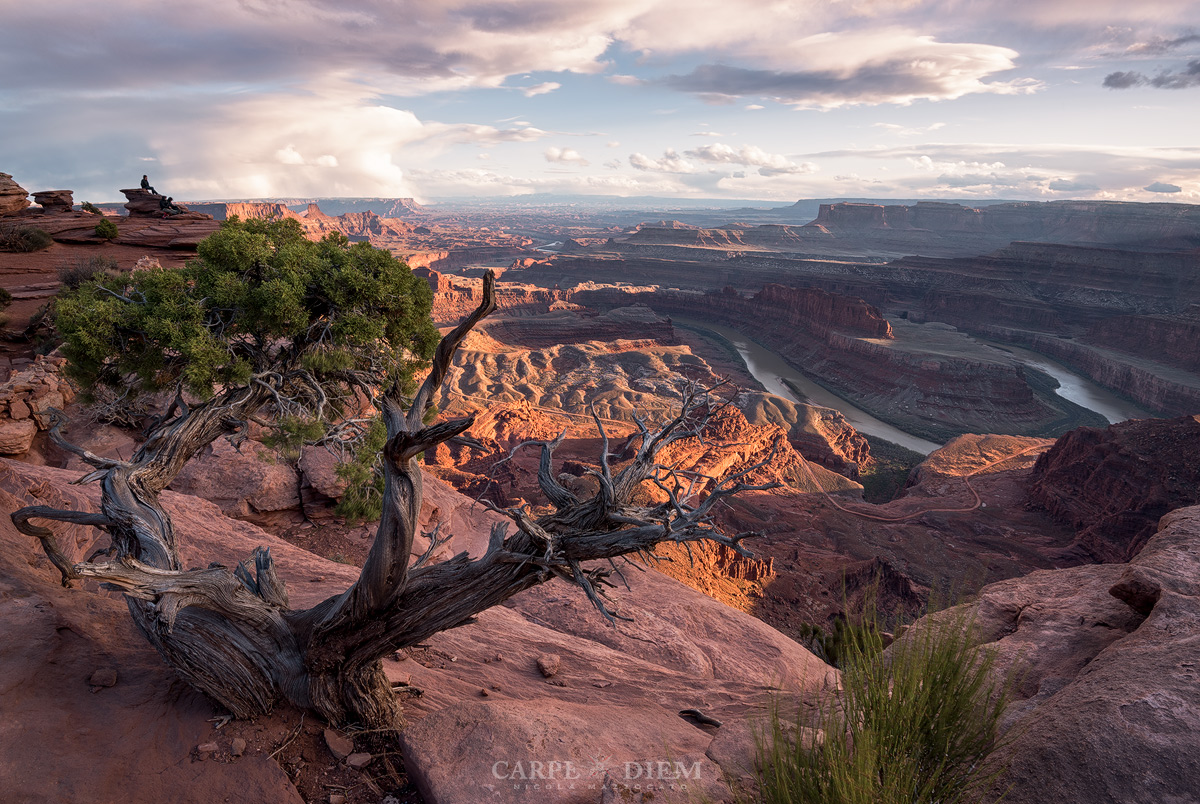Io provo onestamente a considerare il risultato, e basta. E qui ho ben poco da criticare. C'è una visione ampia che contestualizza la vastità del luogo ritratto, non sprecando neppure la bellezza di un cielo ricco di soffici nuvole in viaggio. Le pietre rosate dal tramonto, il celeberrimo ferro di cavallo del fiume attorno ala roccia, non manca nulla. Eppure la scelta più personale, strategica e centrale, è di celebrare la tortuosa lotta per la vita del tenace ginepro, anche al di sopra della acrobazie geologiche, e, come per caso, il piccolo grande uomo, che quasi in punta di piedi ,si integra in sfondo, silenziosamente, in silhouette, quasi mimetico. Tutto è stupore ed emozione ,ed integrazione , davanti allo spettacolo della natura.