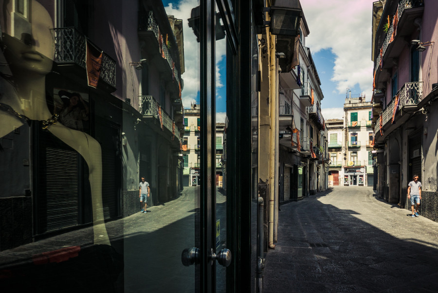Beh, dai, forse non tutti sanno Antonio che a Napoli , la domenica dopo pranzo vuol dire piu o meno alle ore 16.30 motivo per il quale hai trovato un solo passante per mera fortuna e che hai "sfruttato" al meglio in questo gioco di riflessi che a te , in genere, piace molto cercare