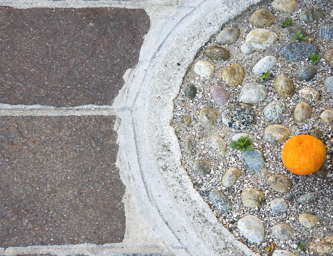 Una sfera di colore acceso , un frutto per valorizzare anche i particolari materici della pietra all'intorno.