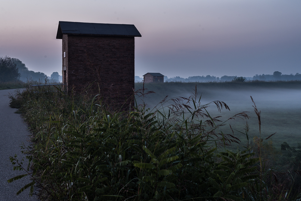 Un paesaggio ancora inmerso nella foschia (del primo mattino immagino)quando la luce inizia a rischiarare e si intravede il paesaggio prendere forma.. La semicurva dell'argine e la porzione di strada a sx donano profondita alla foto.