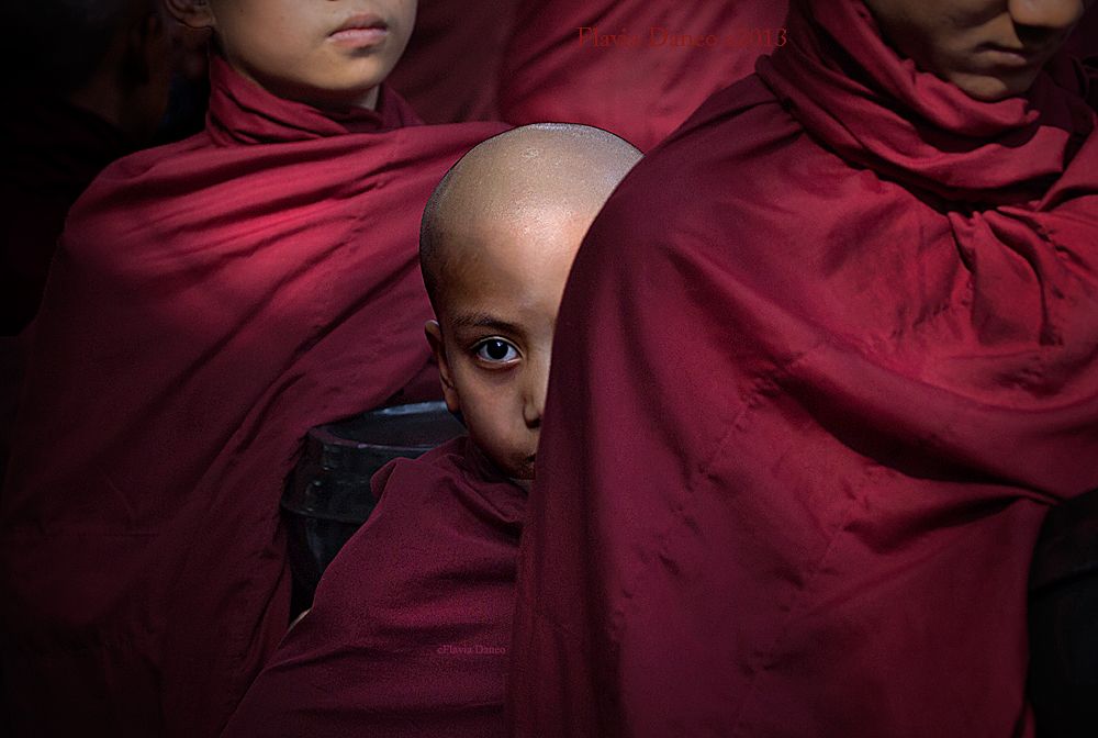 Entri con la forza di un piccolo volto, appena intravvisto fra le tuniche, ma forte della suggestione di uno sguardo che fa capolino nel rosso, e nei chiaroscuri della processione di monaci.