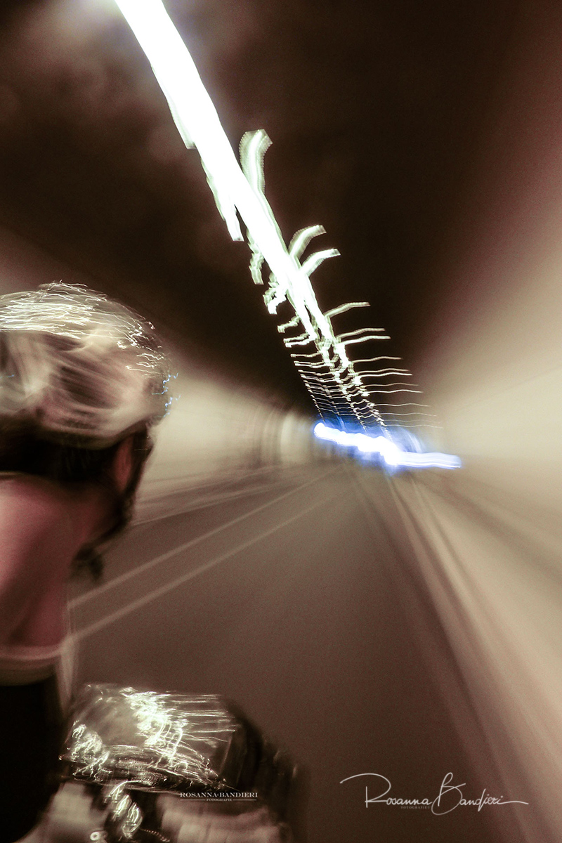Il mosso rende dinamico lo scatto e la luce della galleria dona profondita' prospettica ed arricchisce di grafismi l'immagine. Il ciclista ha un'abbigliamento riflettente che lo fa luccicare come le decorazioni di un'alberello natalizio