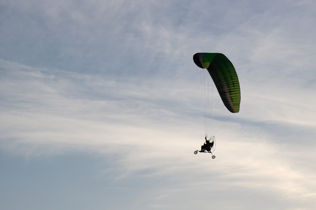 Bello il senso di libertà che trasmette questa immagine.Le rotelline del mezzo aereo donano un che di fiabesco,il pensiero è andato ad E.T.Ottima la composizione ma forse avrei invertito i lati per sviluppare il movimento da sinistra verso destra.Una leggera apertura delle ombre sulla "vela" (non conosco il termine esatto).Complimenti per questo piacevole scatto.