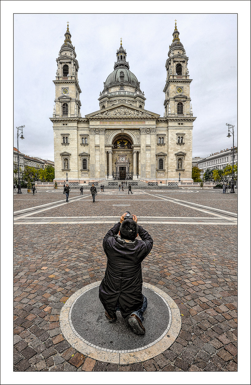 tutto ruota intorno a questo signore che tu hai voluto riprendere in primo piano mentre lui a sua volta stava fotografando la bella Basilica. Un punto focale perfetto che copre degnamente il 16mm con una composizione pignolarmente (è un complimento ) ricercata , ti vedo qui come il discobolo che compiendo la rotatoria (i tuoi occhi) lancia il disco.