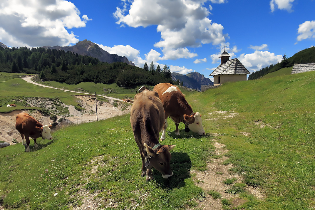 Vedo che hai trovato il sole pieno, magari dopo un sano temporale che ha messo grandi nuvole in cielo. Tanta serenità, con le mucche al pascolo, tranquille, nonostante la tua presenza... fotografica, e il secondo piano con la piccola chiesetta, che sta simbolicamente al centro della scena.