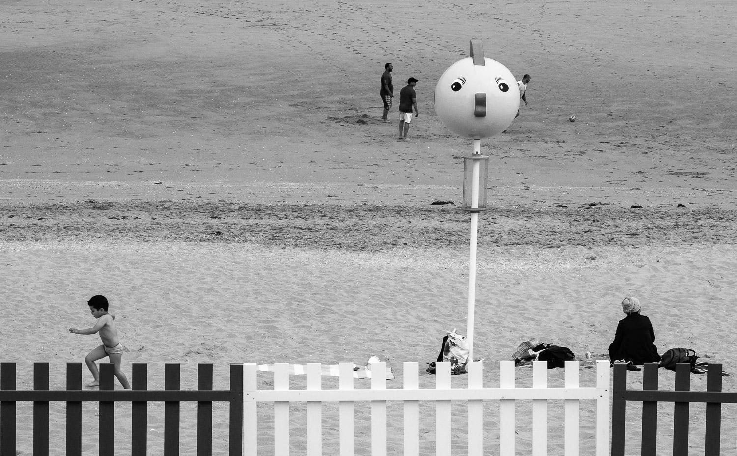 La palizzata ed il simpatico palo si prestano a parecchie idee compositive,buona anche questa,forse avrei atteso una diversa disposizione dei soggetti in movimento per evitare sovrapposizioni.Se hai modo di frequentare questa location può darti molte soddisfazioni.Il bn mi piace.