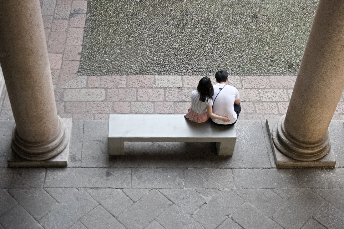 simmetrie davvero accattivanti e sembra che i due ragazzi sia modelli collaborativi dato che sono decentrati nella panchina e foto e la tenera gestualità di lei regala un qualcosa in più alla scena.