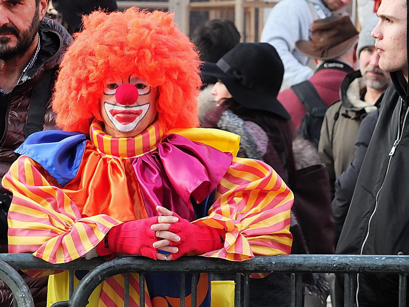 Mi piace questa street perchè ha un effetto straniante. C'e un personaggio vestito da clown, ma nessuno ride e nemmeno sembra rallegrarsi o anche solo notare questa presenza. Lui stesso, ossia il clown, è serio e disinteressato a far ridere qualcuno, quasi assente ed immerso nei suoi pensieri. Lo stesso ambiente circostante sembra partecipare a questa "tristezza" che c'è nell'aria con una folla dall'abbigliamento privo di ogni nota di colore cui si contrappone quasi il grido inascoltato dei chiassosi colori del clown. A mio avviso, scatto più che apprezzabile. A voler essere pignoli regolerei solo la lieve sovraesposizione della parrucca del clown, ma è veramente un'inezia. Ciao