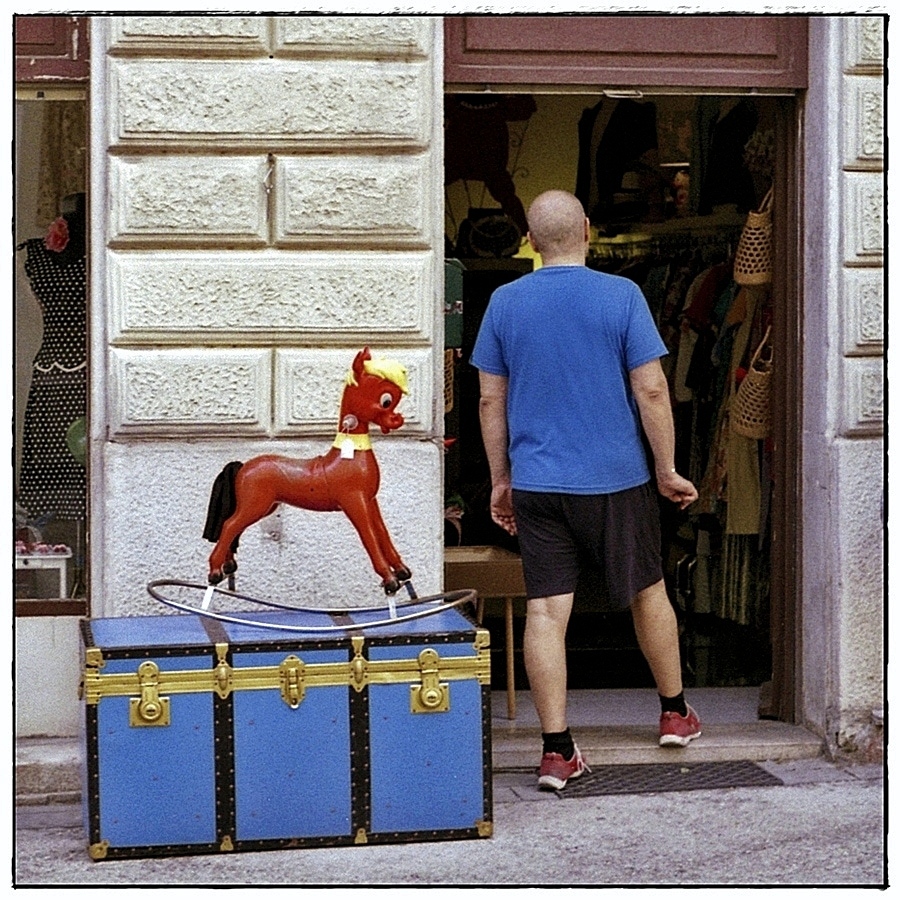 perfetto l'abbinamento t-shirt-baule e scarpe-dondolo, e tu grande occhio nel saperlo cogliere e comporre perfettamente l'immagine. Molto simpatica