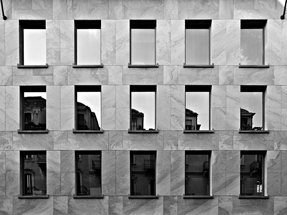 Bellissimo b/n ad accompagnare questa composizione rigorosa, in cui spiccano questi magnifici riflessi, ordinati e al contempo ricchi di dinamismo.
