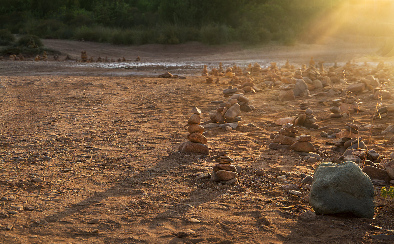 Due eserciti che si fronteggiano dalle sponde opposte del torrente!Luce bellissima che sembra dar vita a queste pile di sassi.Ma dietro questi sassi ci sono realmente delle persone che li hanno disposti confidando loro i propri desideri,le proprie paure.Mi piace molto,la tengo tra le preferite.