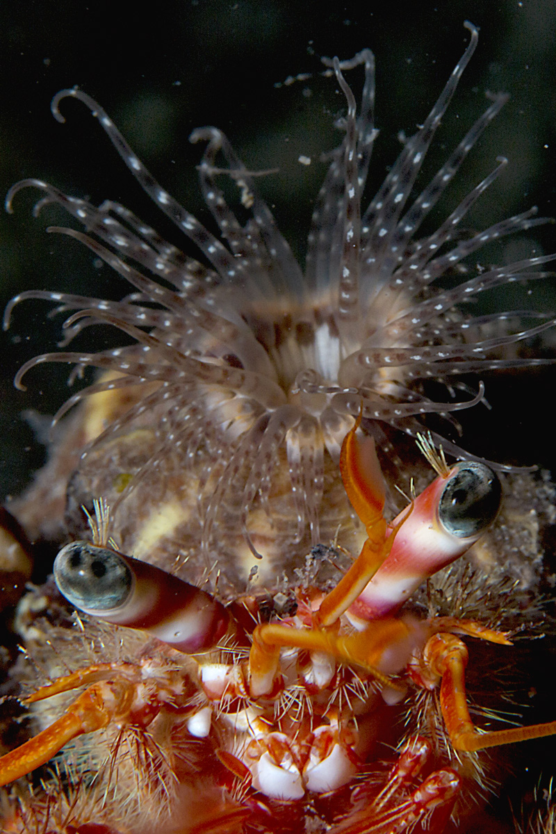 Quando l'ho visto, ho subito notato la piccola anemone che protendeva il ''ciuffo'' subito dietro la testa, e ho cercato di ... evidenziarlo