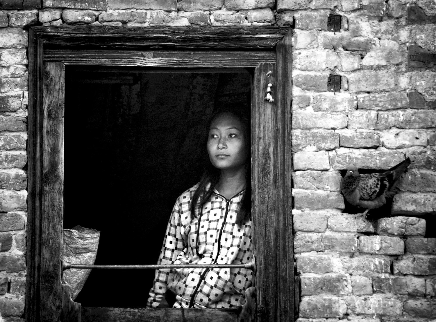Una foto che mi viene da definire "notevole". Mi piace la concretezza della materia, mi piace lo sguardo gentile e timido rivolto altrove della ragazza a cui si contrappone quello sfacciato del piccione. Bello, funzionale e descrittivo il Bianco e Nero. A mio gusto ma solo per provare se ci può stare, abbasserei di un niente o poco più il bianco delle sclere degli occhi e del becco del piccione.