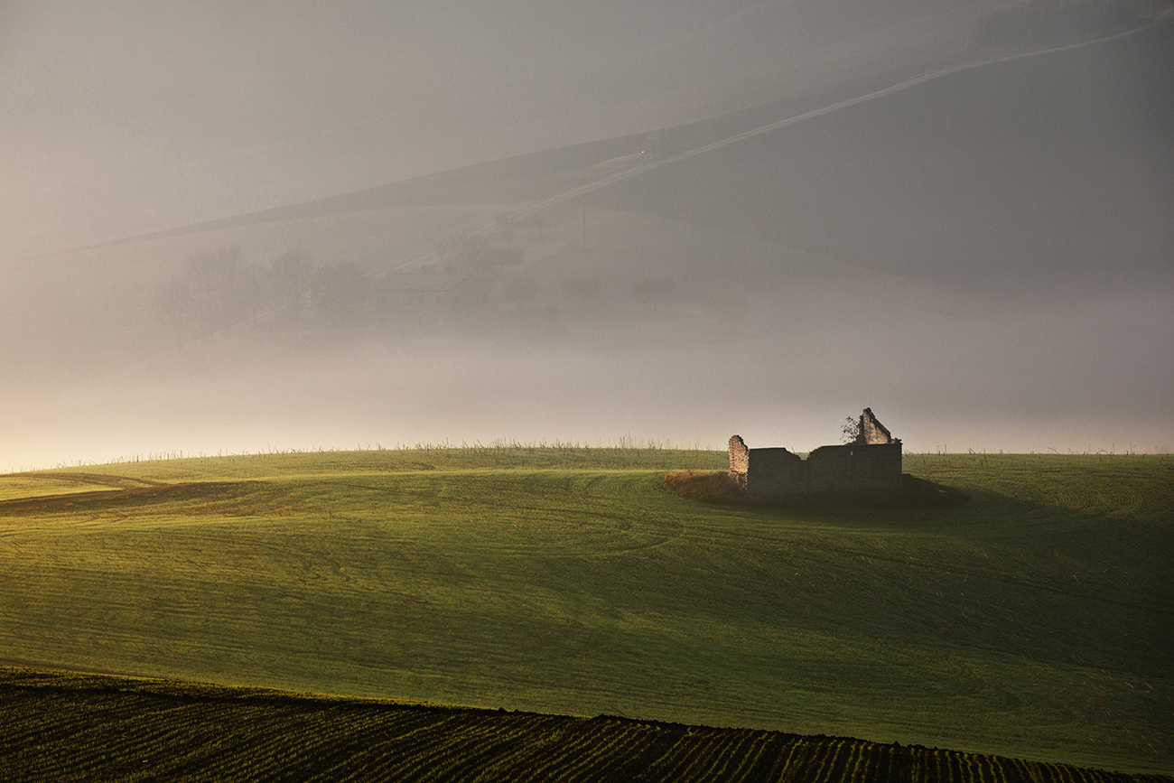 il campo arato che rompe la monotonia del verde prato, e la nebbia che cela un secondo paesaggio dietro che vien voglia di scoprirlo. complimenti ancora.