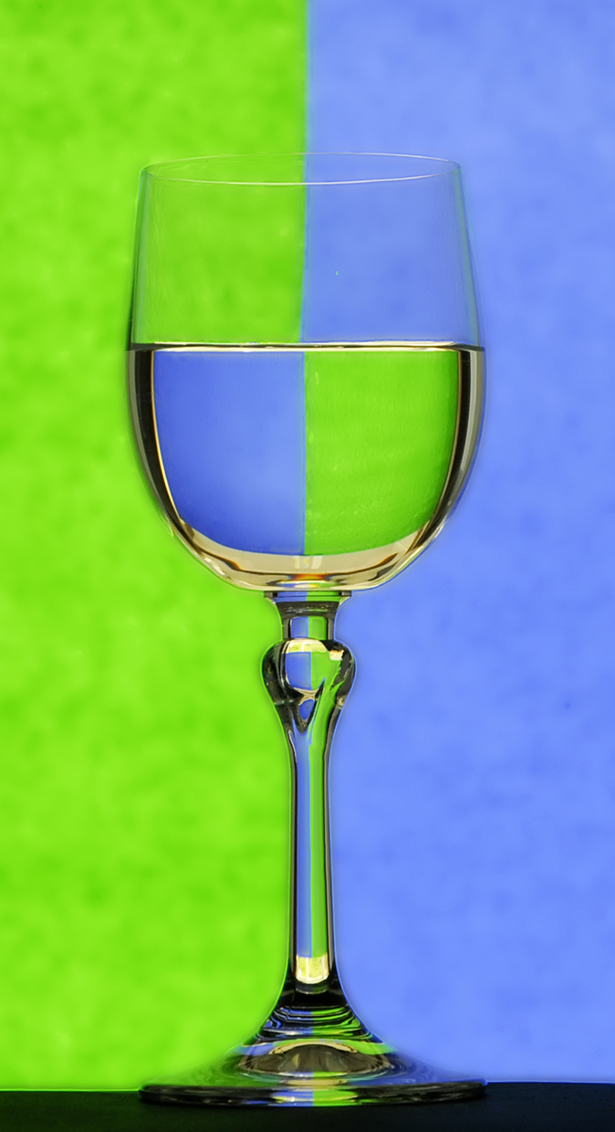 Si tratta solo di un piccolo gioco di rifrazione nel bicchiere c'è solo acqua è lo sfondo che da i colori alterni |