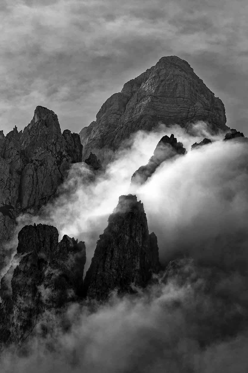 Impressionanti quelle nuvole basse leggere e vaporose che scivolano tra le dure rocce. Un bellissimo panorama accompagnato da un BN croccante e delicato assieme dove serve Ok!