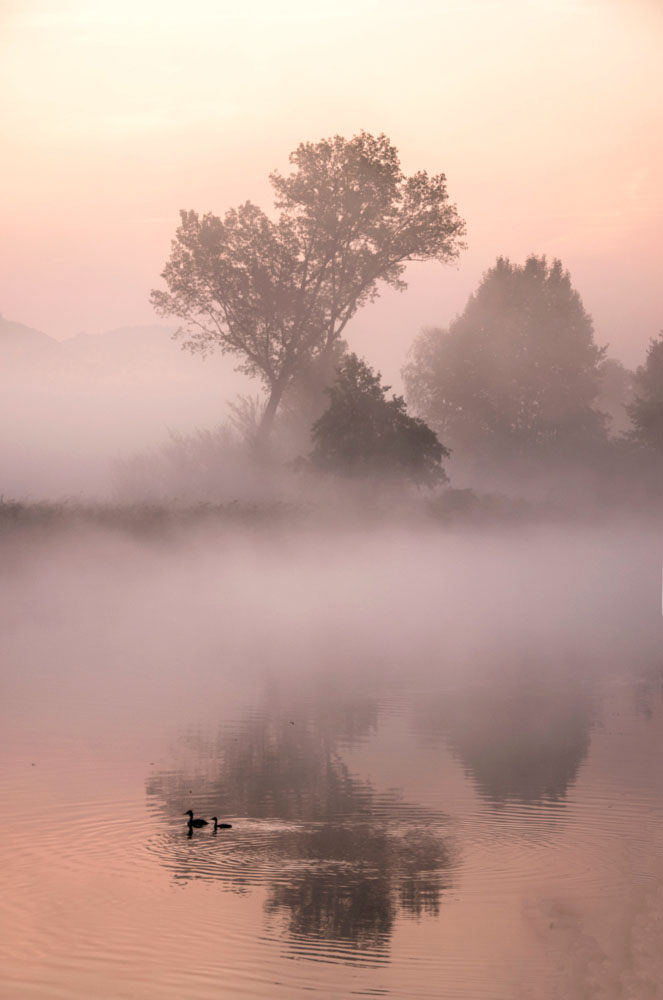 | Ciao Elis,intanto bentrovata. Ottimo scatto giocato sul riflesso in acqua. I due animali con i cerchi concentrici ,creati dal loro passaggio,rompono l'immobilità della scena.La bruma e le delicate cromie rendono il paesaggio quasi fiabesco.Un caro saluto |