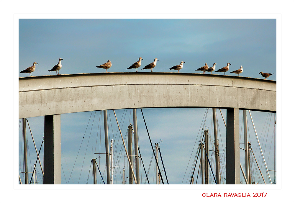 Ciao Clara, gabbiani di vedetta sul punto più alto. Sembrano passeggiare in fila indiana su di un lungo ponte. Una prospettiva vertiginosa ci porta più vicino ai volatili. Un caro saluto e ben ritrovata.