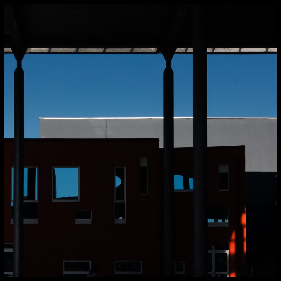 Forme oscure che al loro interno lasciano spazio all'azzurro del cielo.Il riflesso in basso a dx non scopre soltanto il colore semi-celato della facciata ma aggiunge valore allo scatto.Per me ottima foto.Ciao Randagino Ciao