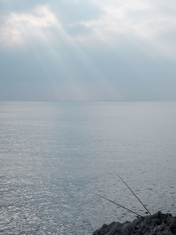 Bellissima atmosfera, impreziosita da questo dialogo lineare fra i raggi di luce e le canne da pesca, quasi sullo stesso tracciato. E non v'è traccia di pescatori!