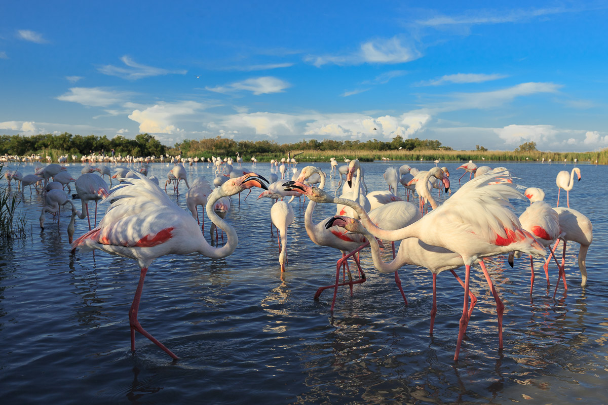 bellissimo scatto, pieno di vita e colori, e non mancano neanche i molti fotografi dall'altra parte della laguna ...per me la foto è dritta ( controllata ), la linea di demarcazione tra acqua e canne in questo caso inganna, ci sono zone che non si trovano sullo stesso piano.