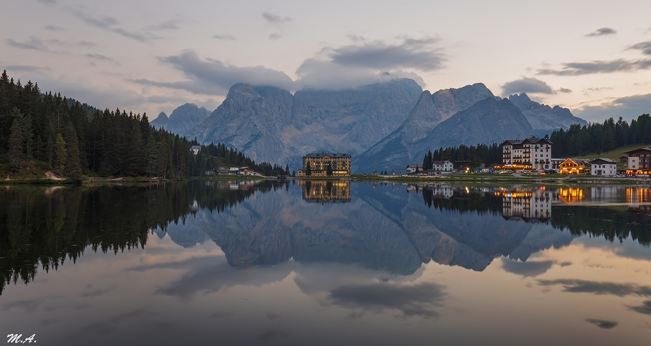 Tutta giocata, a mio parere con successo, sull'equilibrio e la precisione delle simmetrie e delle riflessioni. Più la guardi ....e più ti accorgi della cura minuziosa dei particolari, delle lucette scintillanti, ma ma contenute nel loro brillio. c'è un prezioso senso di bellezza, condita da ariose grandiosità montane e incombenza di nubi, eppure con tanta, tantissima intimità, nelle case in lontananza e nel calore raccolto delle luci accese. Stellina di preferenza.