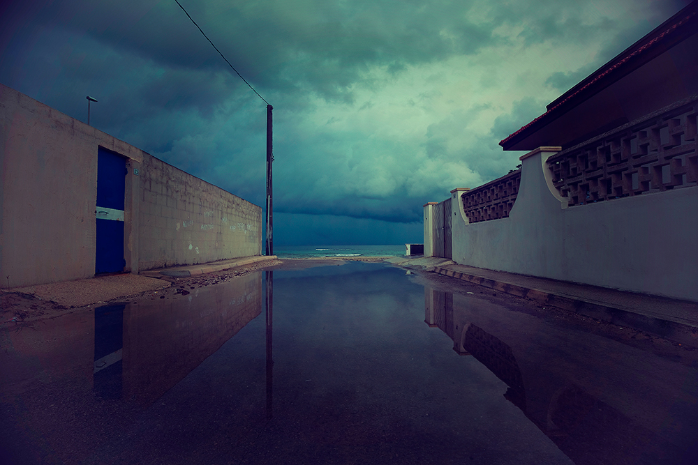 Un letterale lago d'acqua, lascito delle violente piogge, sfida l'azzurro verde del mare in sfondo. Fotograficamente il soggetto si presta a forte contrasto e brillantezza, di acqua in acqua, fra nubi ancora minacciose , e cabine che si riflettono oscure , duplicandosi nel centro allagato.