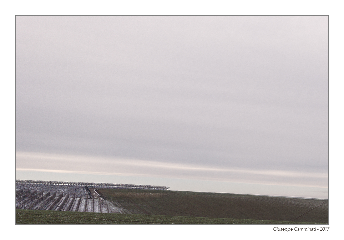 Ciao Giuseppe, un paesaggio a tratti pittorico con un cielo predominante fatto di velate pennellate mentre in basso la sottile striscia dell'orizzonte è l'appiglio che ci riporta alla realtà. Una realtà invernale...