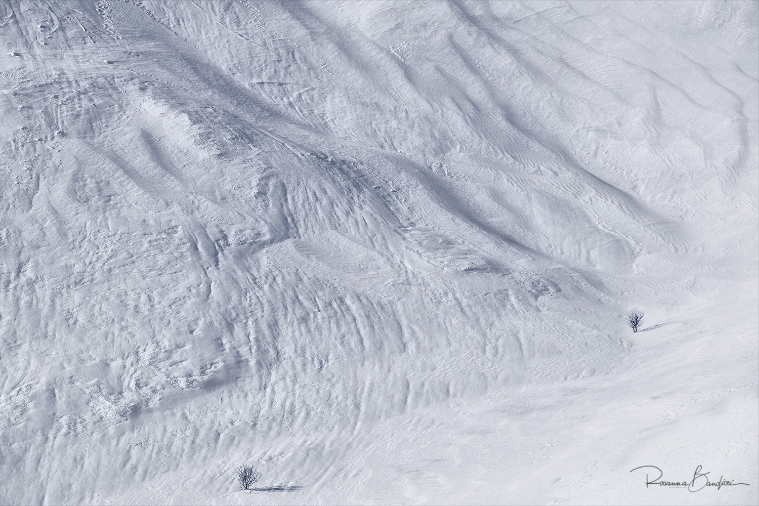 Adoro il dettaglio di ogni tratto innevato di questo splendido paesaggio. Quelle due solitarie ma tenaci presenze sono di una forza compositiva disarmante. Davvero eccellente  |