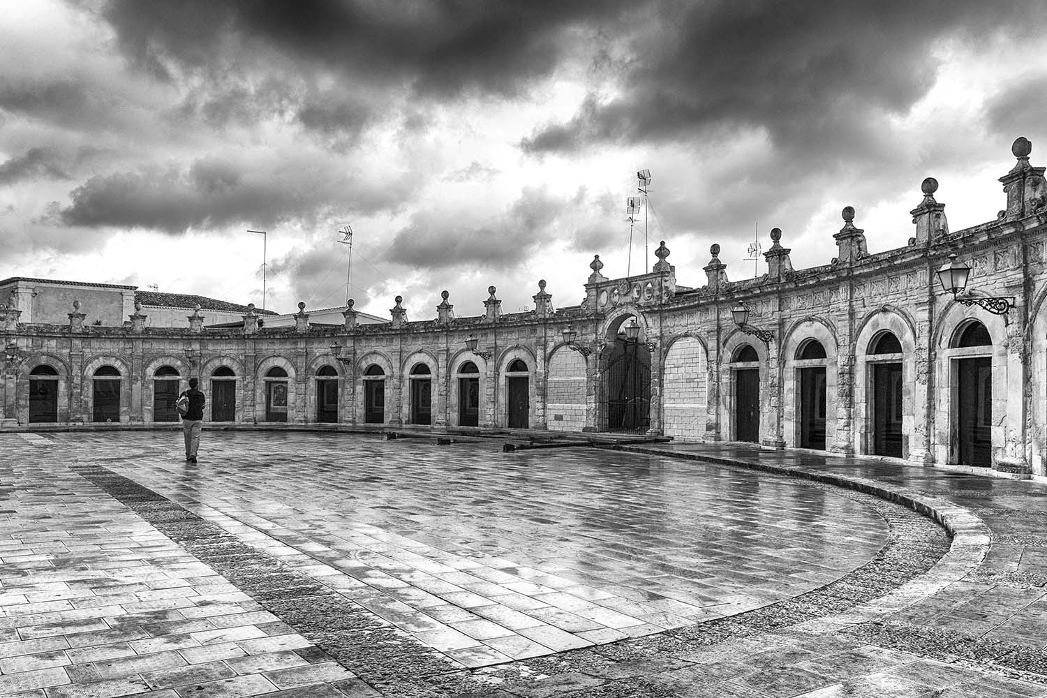 Un bianco e nero lucido ed incisivo nei contrasti , per valorizzare la curva di questa piazza, e la linea della costruzione all'intorno, con le bocche oscure della serialità delle arcate. Austera ed importante, alleggerita appena, dalla singola presenza umana in passaggio.