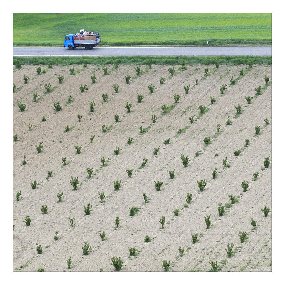 Il formato pari lato ben si adatta a questa ripresa che esalta le geometrie naturali del campo coltivato, mentre il passaggio in blu del camioncino immette una nota spiritosa, di colore eletrico, quasi scanzonata, nel particolare paesaggistico. Molto carina.