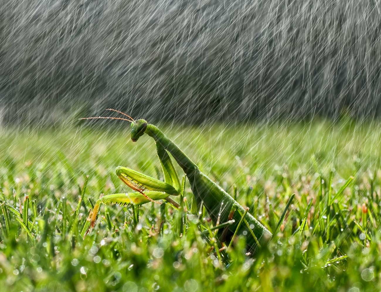 Dall'atteggiamento della mantide, che pare sofferente, sembrano colpirla aghi di pioggia.