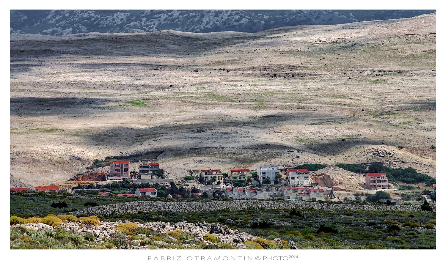 | Le linee orizzontali tracciate dai diversi piani dell'immagine infondono un senso di tranquillità anche se le ombre delle nuvole sulla collina fanno pensare ad una paesaggio in divenire. La linea tracciata dal paesino dai tetti rossi si appoggia su una collina dai tenui colori che trova profondità nell'ultima fascia di montagne in lontananza. |