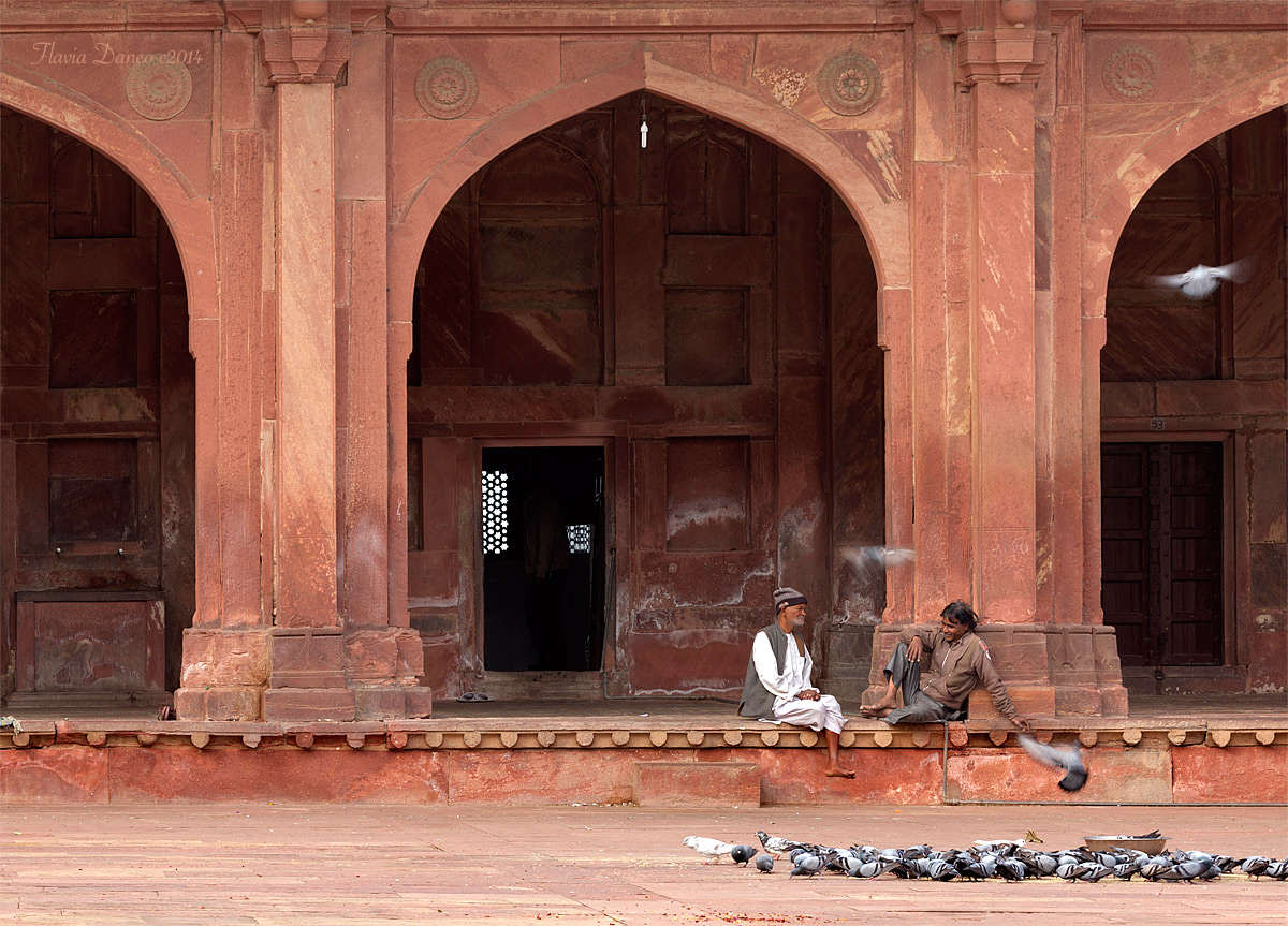 Un'altra notevole foto di viaggio con una buona composizione arricchita dalle cromie dell'edificio, insolite per il mondo occidentale, e dai piccioni colti in volo.