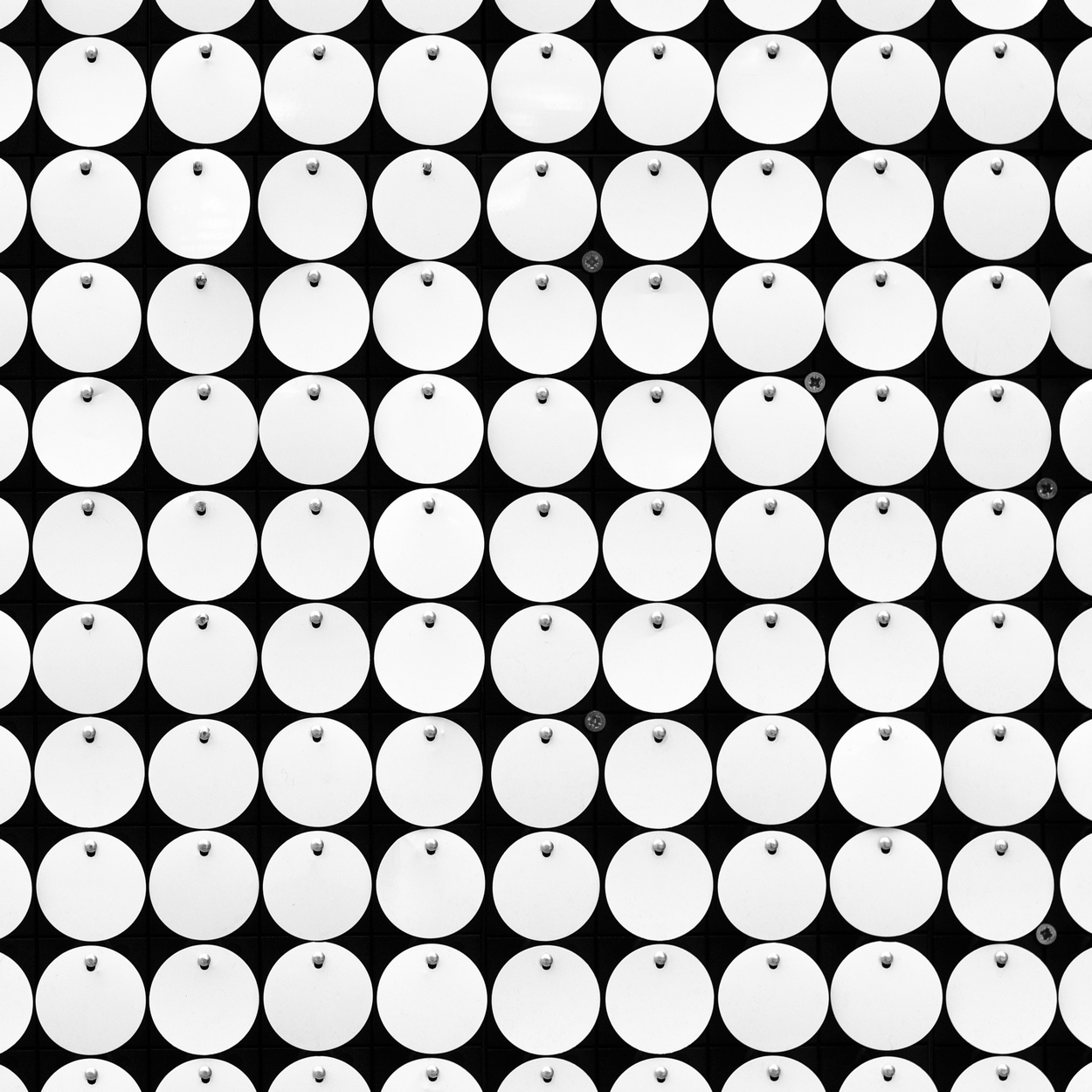 Si tratta di un dettaglio della facciata di un negozio di abbigliamento a Milano: sono tanti piccoli dischi di plastica color perla appesi a un pannello più scuro.