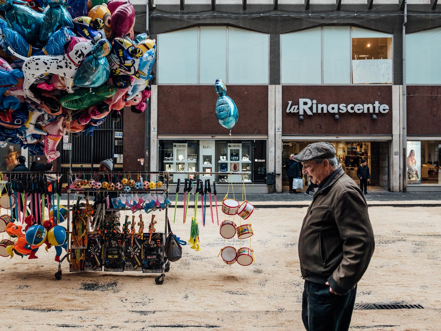 Credo che il motore dello scatto sia il contrasto tra l'anziano signore e la bancarella ambulante coi giocattoli e palloncini per bambini.