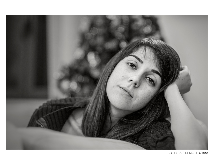 Ci sono un paio di elementi di disturbo come lo schienale del divano (?) in primo piano sfuocato, e l'albero di Natale sullo sfondo, però forse è una mia fissa che il ritratto dev'essere concentrato solo ed esclusivamente sul soggetto senza oggetti o persone a distrarne la lettura.