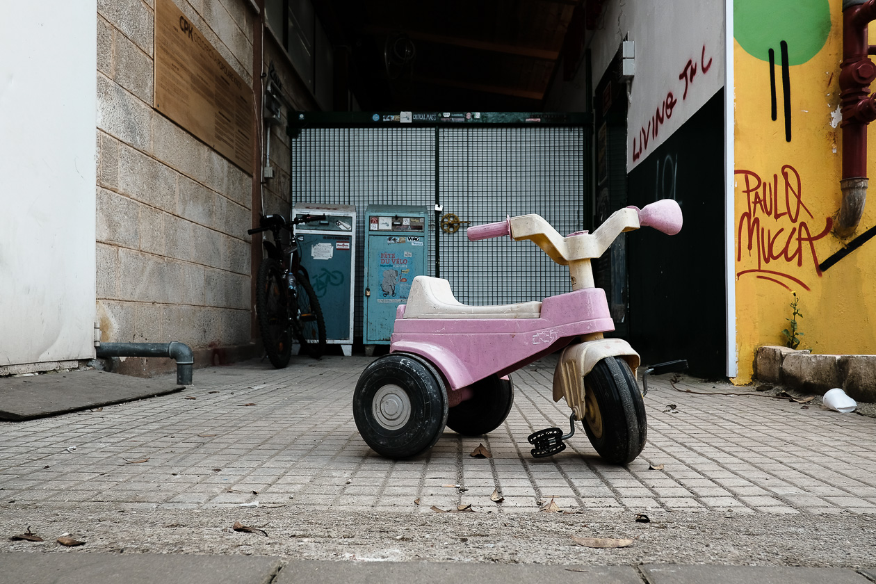 Gran punto di ripresa che privilegia l'aliena presenza del piccolo triciclo dai delicati colori su uno sfondo a prima vista "duro" ma che poi rivela punti di contatto.Sempre estremamente interessanti le tue visioni.