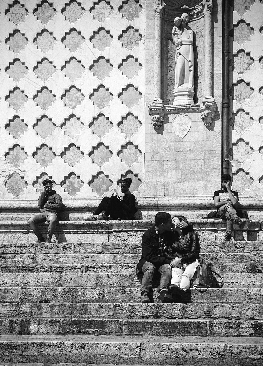 Immagino che alla fine tu abbia voluto come quarta presenza al bacio anche la statua di Gesù e Madonna. Questo ti ha costretto ad allargare il campo e con la luce tremenda che c'era, sole a picco, hai un poco perso le espressioni dei tre astanti.